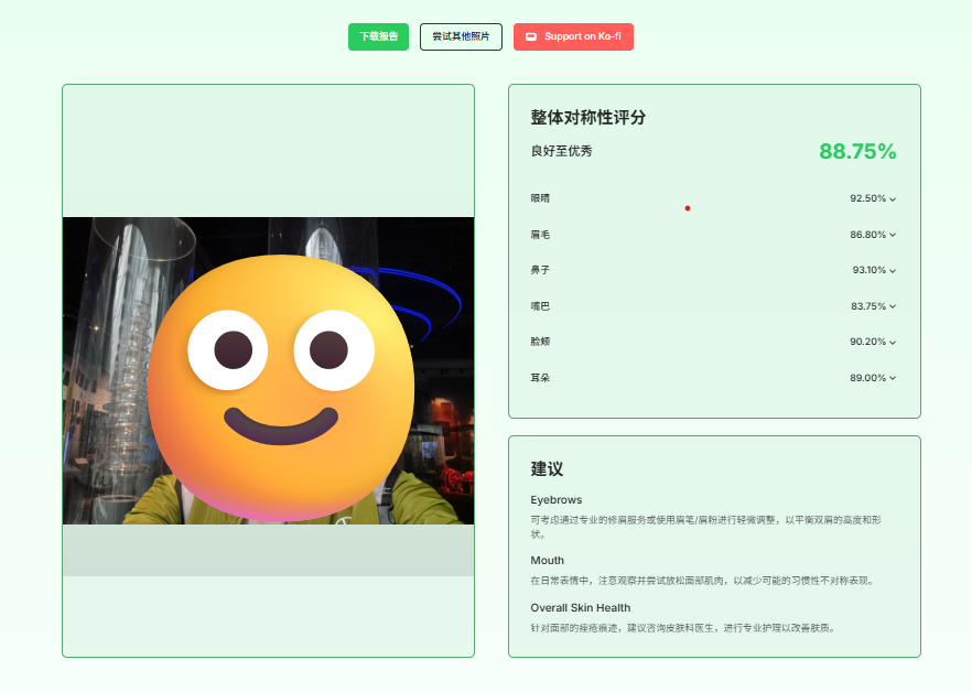 如果您像我一样对自己脸部对称分析和颜值评分感到好奇,可以试试进行这个AI面部对称性测试,当然别太认真,就图个乐子。