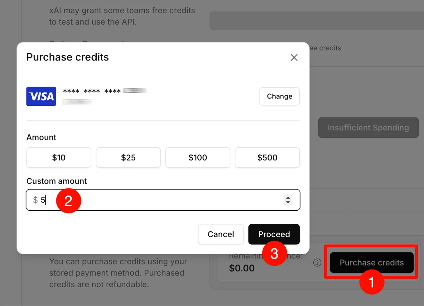 进入 Credits 页面,点击 Purchase credits 按钮,输入 5 美元,并支付即可,支付完毕后可能会等待几分钟时间才能到账。