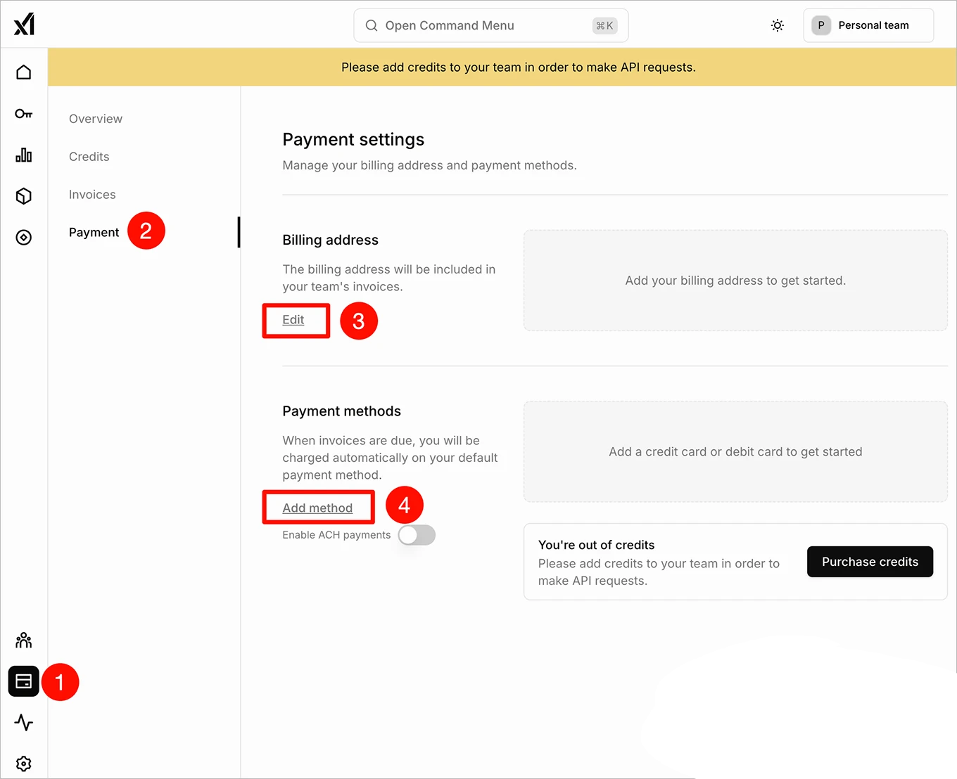 进入 xAI 开发者平台的 Payment 页面,点击 Edit ③ 填写 Billing address (账单地址)