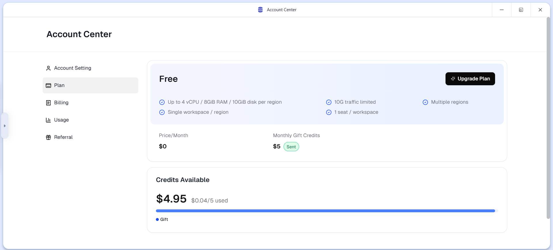 对于每一个新注册的用户,ClawCloud Run 提供 5 美元的优惠,有效期为一个月。如果用户在注册后一个月内绑定 GitHub 账户,此后每个月都会额外获得 5 美元的免费额度 。免费计划包括最多 4 vCPU、8GiB 内存、10GiB 硬盘资源和 10GB 流量 (如果你的 GitHub 账户超过 180 天),这对于个人及小型项目的开发来说已经足够。