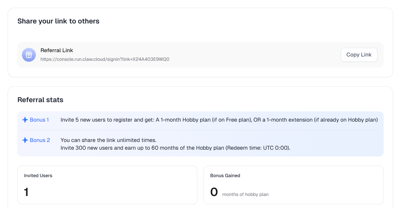 另外,ClawCloud Run 还提供了推荐奖励计划,鼓励用户邀请新用户注册。以下是具体的奖励细则 :