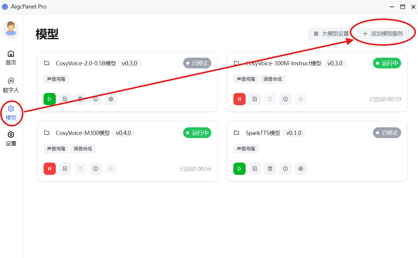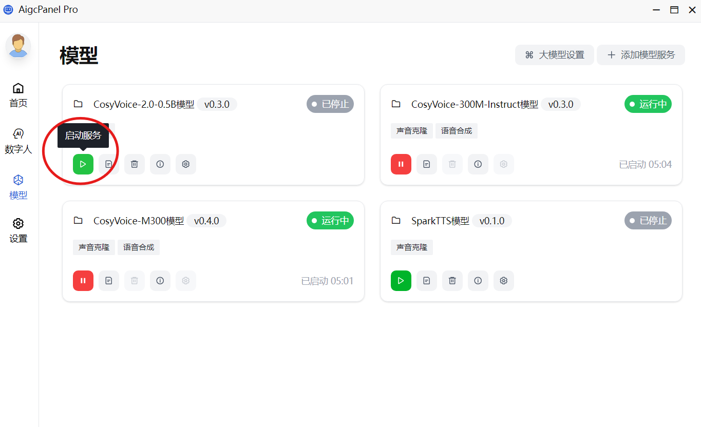 - 下载并导入模型后,点击“启动服务”。